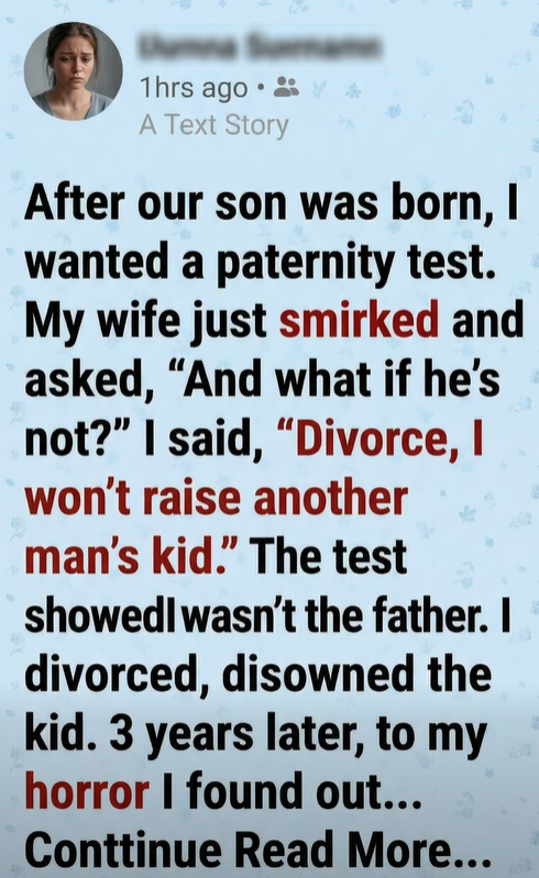 Three years later, that certainty collapsed in a coffee shop. A mutual friend revealed the truth: the lab had made a mistake. Emma had been faithful all along, and the child I abandoned was biologically mine. By the time the error was proven, I had entirely blocked her from my life.